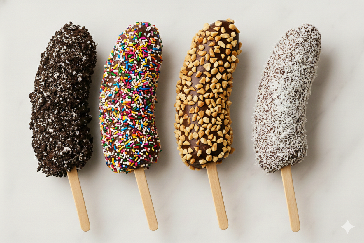 Pincho (pronounced PEEN-cho) is a Spanish word meaning food served on a stick. Inspired by popular Latin street snacks, Pinchos Chocolate Dipped features frozen fruit and cheesecake pinchos dipped in rich chocolate, finished with sweet drizzles and flavorful toppings for a fun, handheld dessert experience!